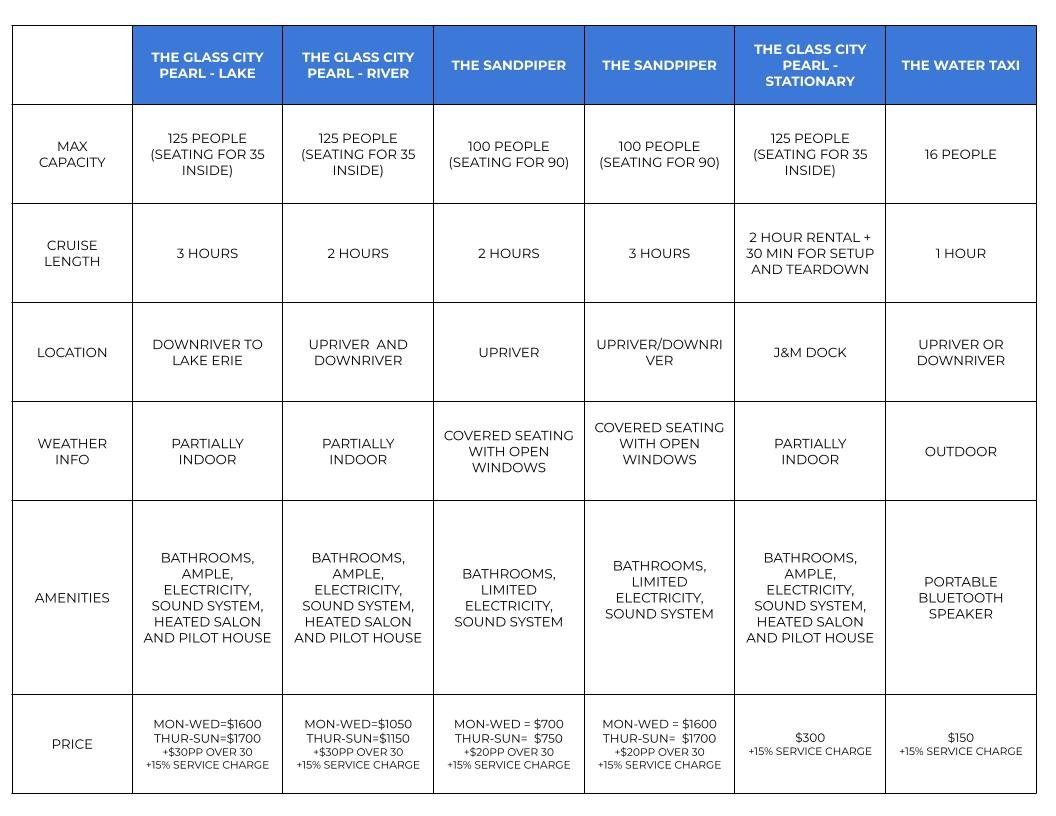The Glass City Pearl is a 64 foot, multi level boat, with a yacht feel, that holds up to 125 people. The Glass City Pearl provides all of our Lake Erie cruises.